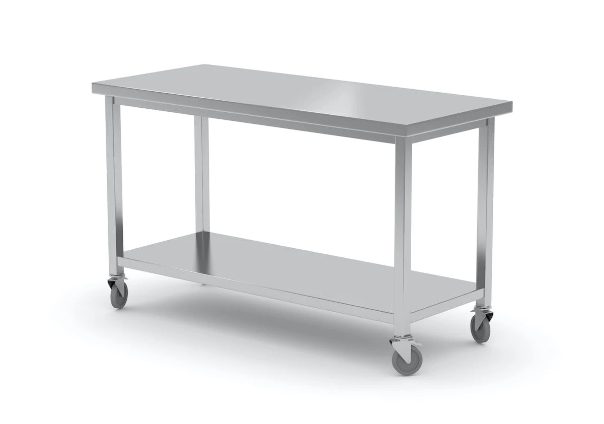 Sehr stabiler, mobiler Gastro-Arbeitstisch auf Rollen aus Edelstahl AISI 430. Der Arbeitstisch hat eine Höhe von 85cm und eine Tiefe von 60cm oder 70cm. Die Tische sind in einer Breite von 100cm bis 160cm verfügbar. Das Innenmaterial der Arbeitsplatte ist aus Kunststoff und damit natürlich wasserfest und schmutzresistent. Der Tisch ist in Handarbeit verschweist, damit enorm stabil und auch für hohe Arbeitslast bestens geeignet. Ein großer Vorteil des Tisches ist die Mobilität durch die Rollen. Die 4 Rollen haben einen Durchmesser von 12,5cm und zwei Rollen sind mit einer Feststellbremse versehen, um den stabilen Stand zu gewährleisten.