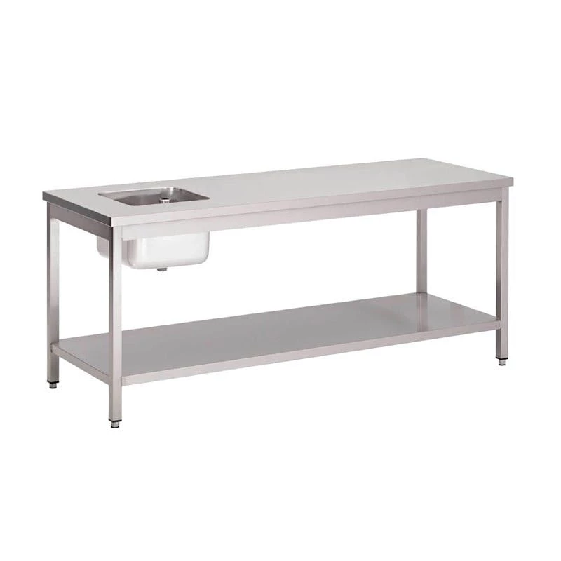 Mit Aufkantung und Regalboden | Edelstahl | 85 x 120 x 70cm Diese Arbeitstische sind komplet aus Edelstahl AISI430 hergestellt. Die Standard Arbeitshöhe ist 85cm und kann durch die höhenverstellbaren Füße auf 92cm erhöht werden. Die Arbeitsfläche ist mit einer 18mm starken Melaminplatte verstärkt. Die Beine sind aus 4 x 4cm Vierkantrohr.